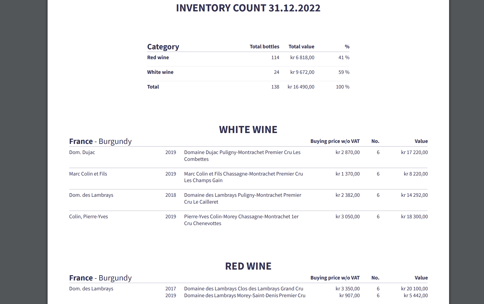 A PDF is automatically generated of the count, with a summary of the categories in the cellar and per individual wine.